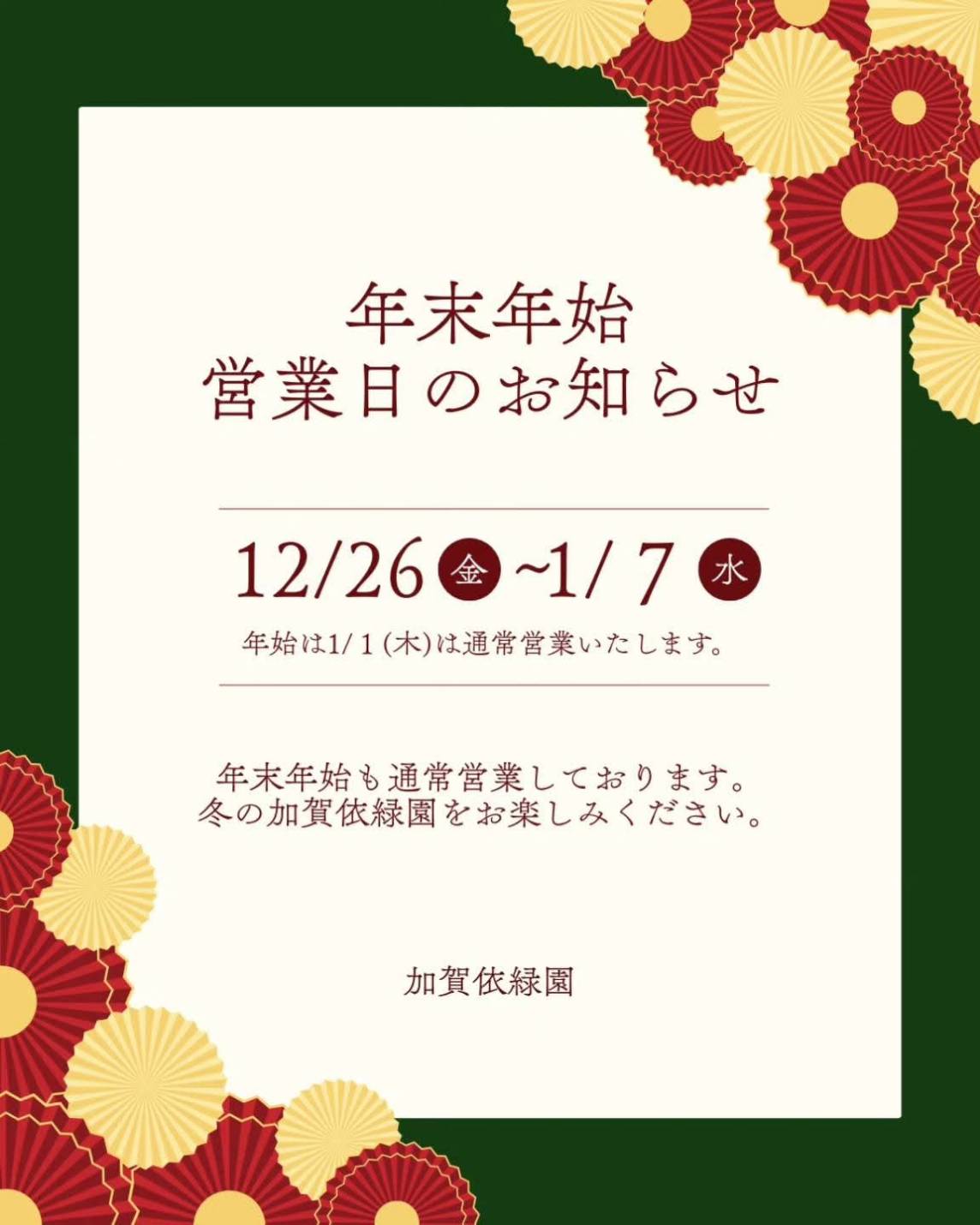 年末年始の12月26日(金)~1月7日(水)は休まず営業しております。雪吊りや雪景色など冬の加賀依緑園をお楽しみください。