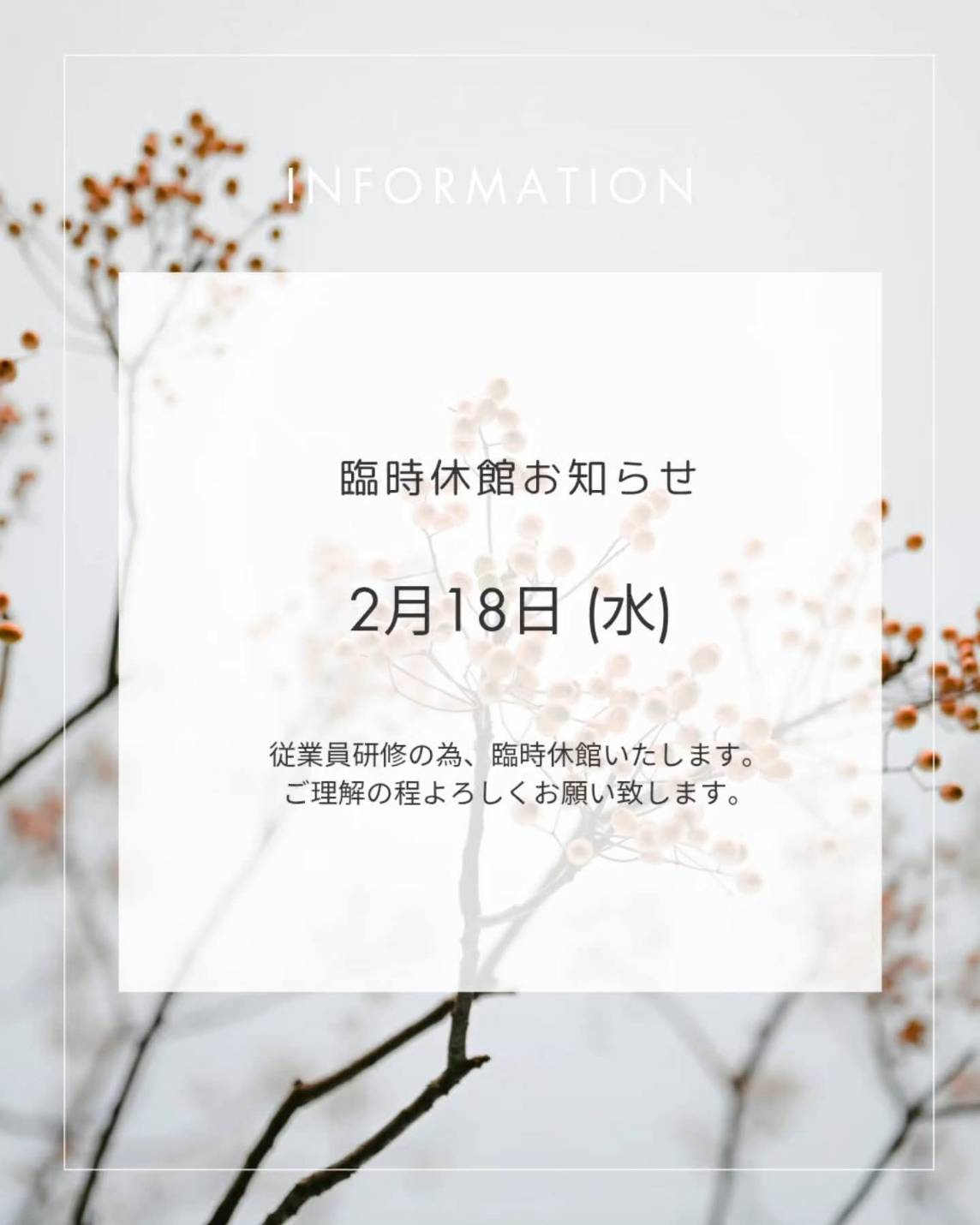 10月8日(水)は従業員研修の為、臨時休館日とさせていただきます。よろしくお願いいたします。